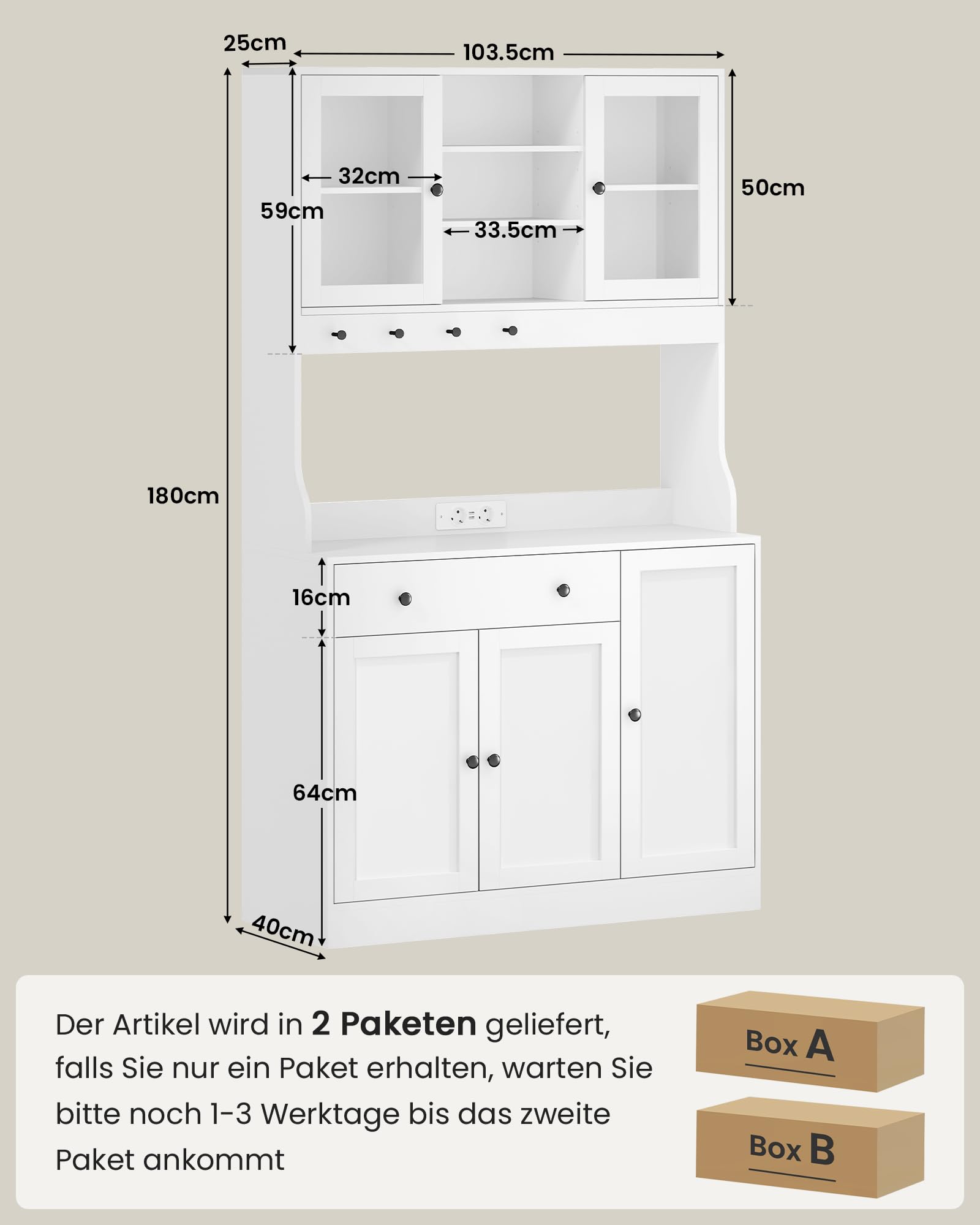 • Lieferung und Montage: Der Küchenschrank wird in 2 Paketen geliefert, die zu unterschiedlichen Zeiten eintreffen können. Bitte montieren Sie das Küchenbuffet erst nach Erhalten der beiden Pakete. Sie können sich das Installationsvideo auf der Seite ansehen, um die Montage zu erleichtern. Falls Sie einen beschädigten Küchenschrank erhalten oder Zubehör fehlt, zögern Sie bitte nicht, uns zu kontaktieren. Wir stehen Ihnen jederzeit zur Verfügung!