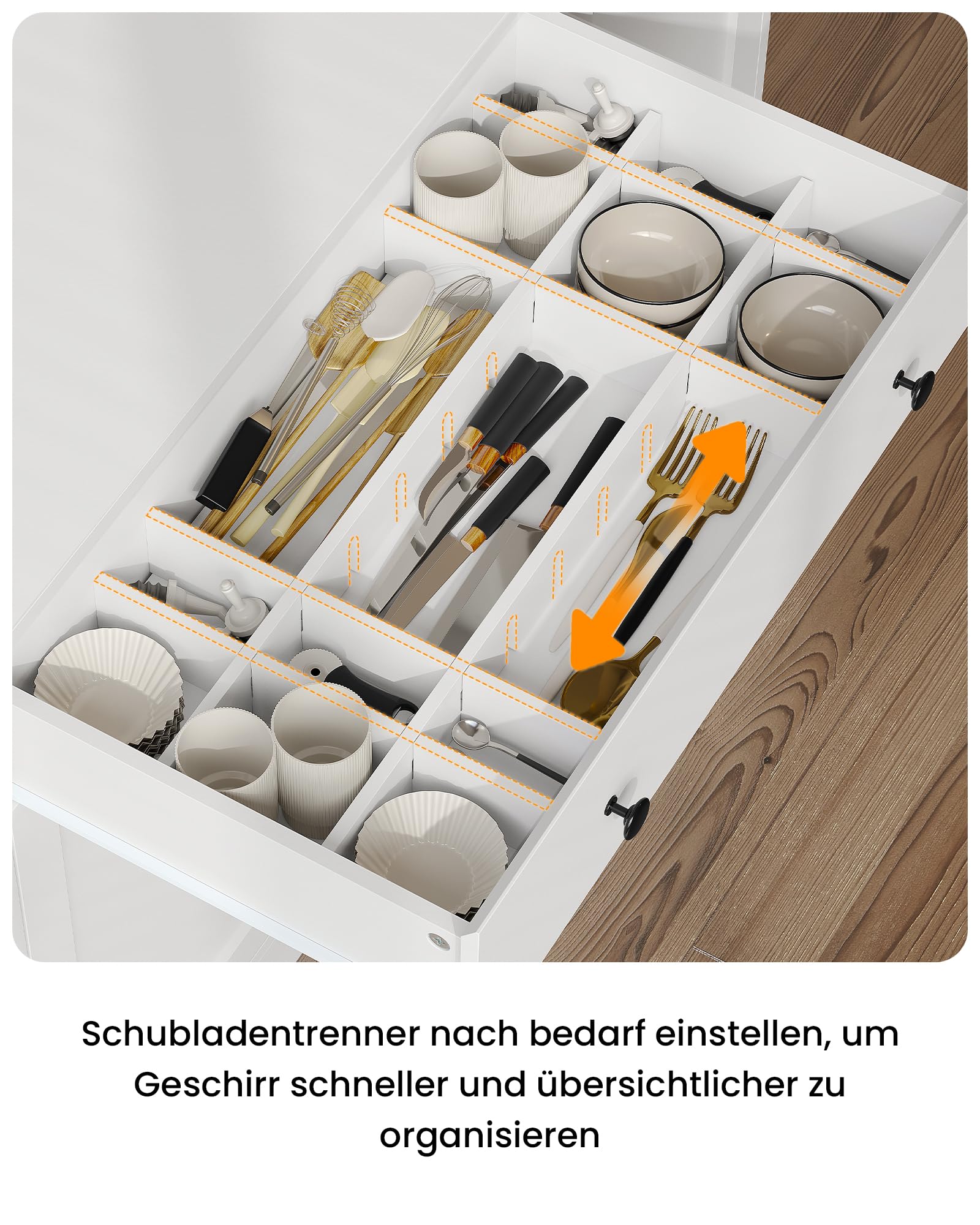• Verstellbare Ablagen: Außer den 2 Ablagen von dem unteren rechten Schrank sind alle Ablagen verstellbar. Die Ablagen der oberen Vitrine und offenen Regale sind einstellbar, die Einlegeböden von dem unteren linken Schrank sind in 5 Stufen einstellbar, während die Schubladen mit Einlegeböden versehen sind, die ebenfalls nach eigenen Bedürfnissen verstellt werden können. So können das Besteck und Küchengeräten platziert werden, um die verschiedenen Lagerungsanforderungen zu erfüllen