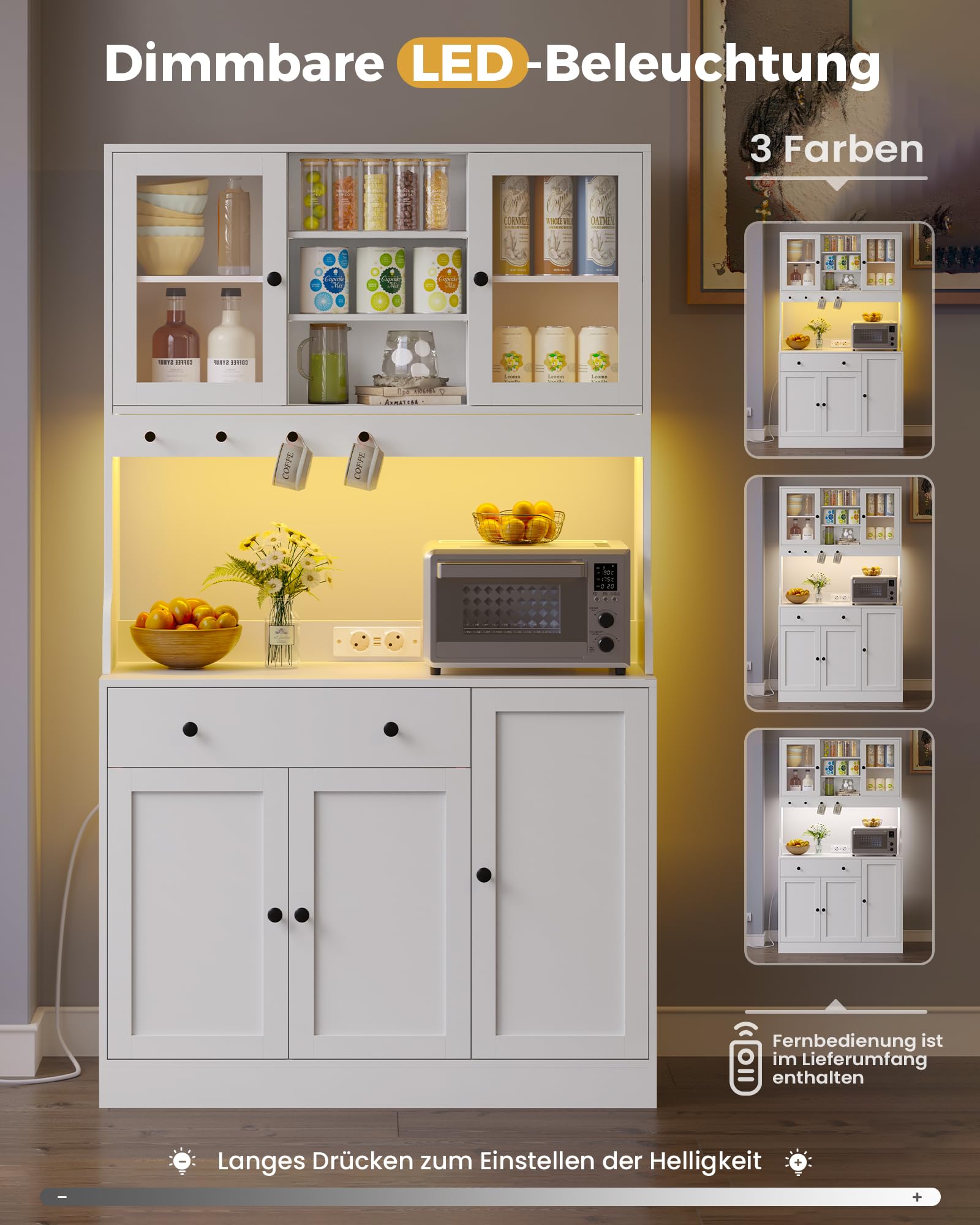 • Dimmbarer Licht-Streifen: Die Lichtleiste von diesem Küchenschrank ist in 3 Farben (Kaltweiß, Neutralweiß, Warmweiß) dimmbar und mit der Fernbedienung oder Taste kann die Helligkeit verstellt werden, um die Beleuchtungsanforderungen in verschiedenen Szenen zu erfüllen. Dieses Küchenbuffet kann in der Küche oder als Vitrinenschrank und Bücherschrank im Wohnzimmer verwendet werden