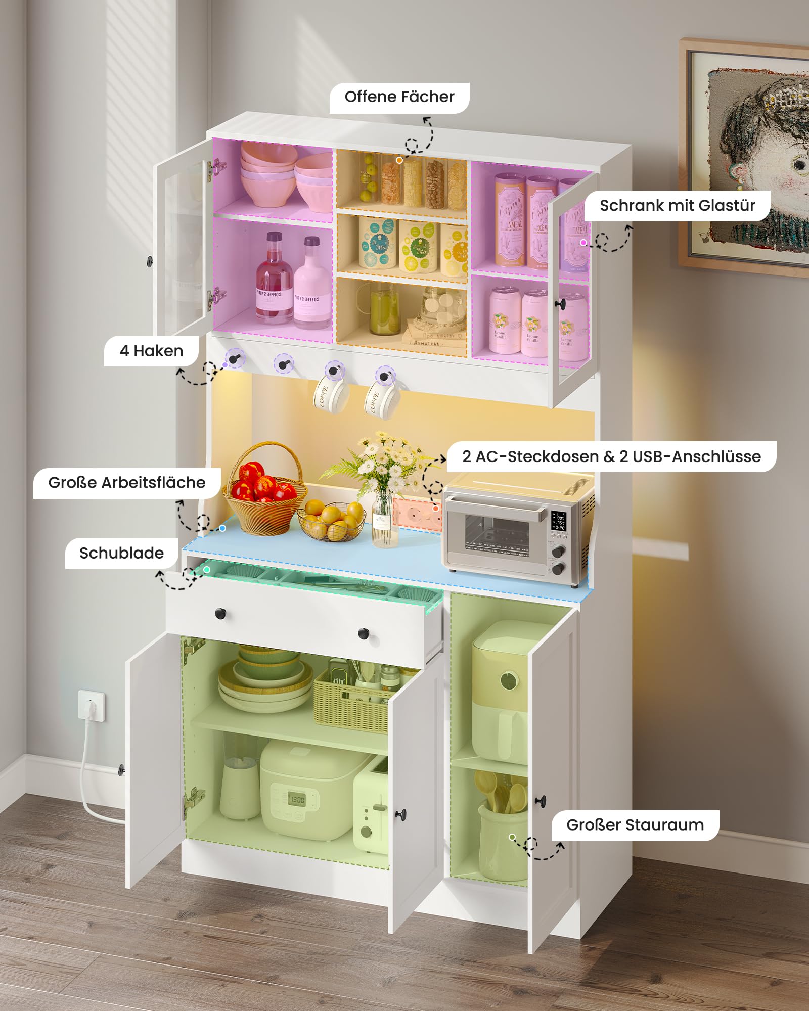 Küchenschrank mit Arbeitsplatte, Sideboard mit LED, Steckdose, Buffetschrank mit Schubladen, Verstellbaren Ablagen, Großer Stauraum, Küche, Wohnzimmer, Esszimmer, 103.5 * 40 * 180 cm, Weiß